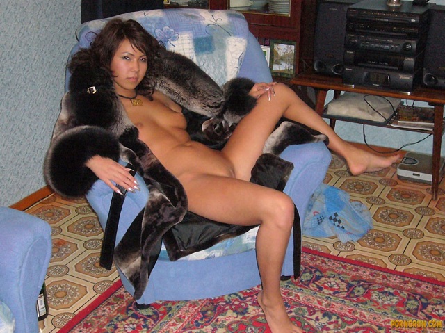 Бритая пизда и маленькие сиськи узбечки хорошо видны пока она сидит голая с накинутой шубой
